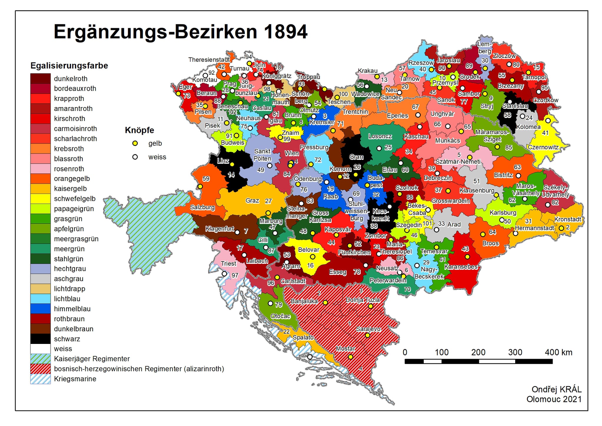 Mapa doplňovacích obvodů pěších pluků s barevným označením odpovídajícím výložkám pluků (autor: Ondřej Král)